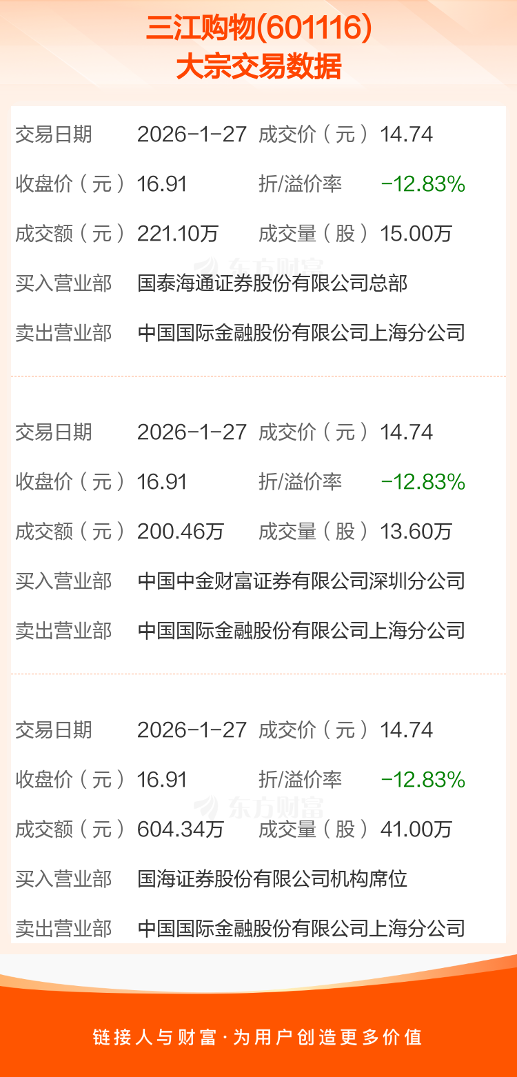 2026年1月27日,三江购物发生3笔大宗交易,共成交69.60万股,成交金额1025.90万元,占其流通市值比例为0.11%。