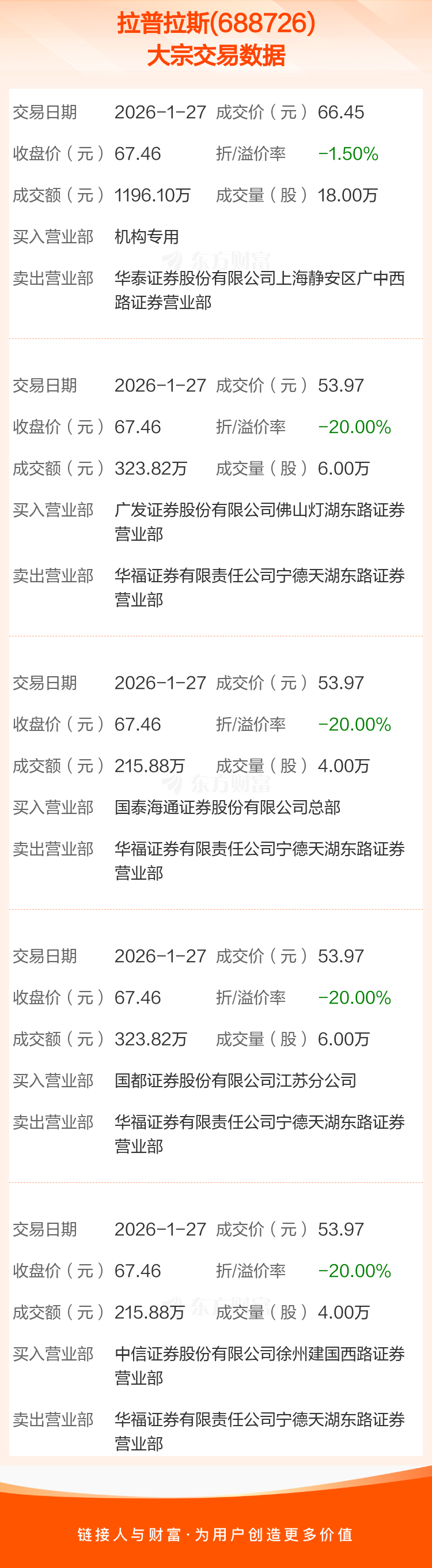 2026年1月27日,拉普拉斯发生5笔大宗交易,共成交38.00万股,成交金额2275.50万元,占其流通市值比例为0.15%。