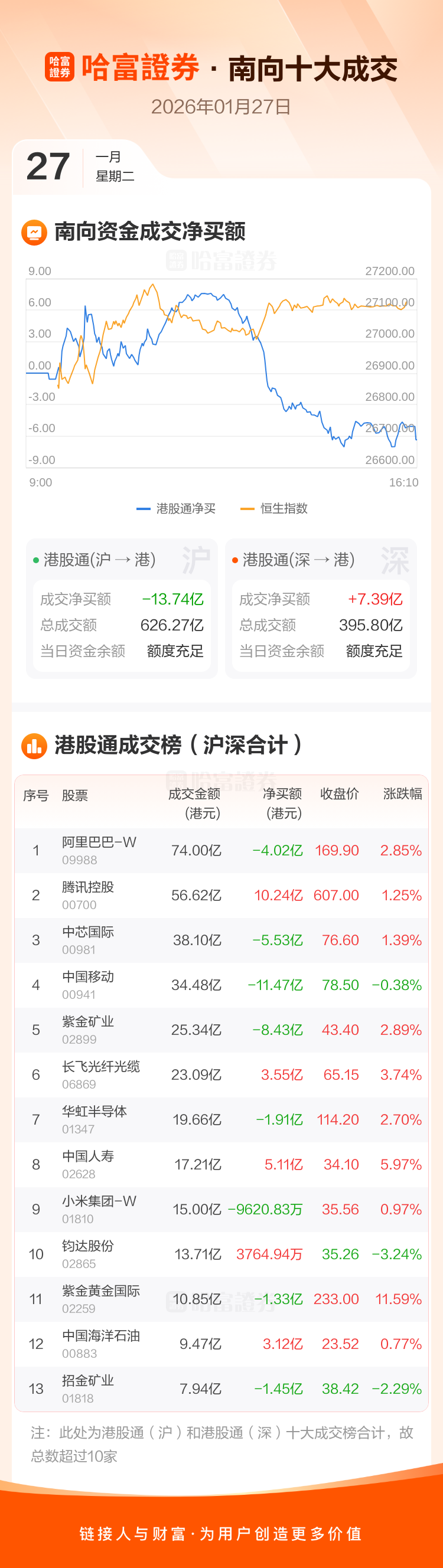恒生指数1月27日涨1.35%,收报27126.95点。南向资金今日净卖出港股6.35亿港元。南向资金今日成交额1022.07亿港元,港股大市成交2543.73亿港元。