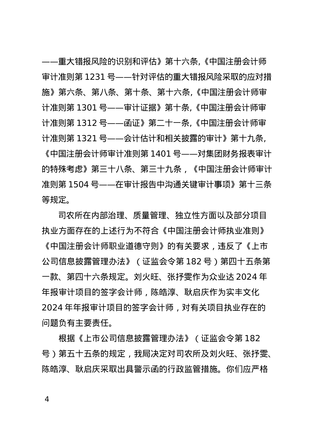 上述行为不符合《中国注册会计师执业准则》《中国注册会计师职业道德守则》的有关要求,违反了《上市公司信息披露管理办法》的规定。刘火旺、张抒雯作为众业达2024年年报审计项目的签字会计师,陈皓淳、耿启庆作为实丰文化2024年年报审计项目的签字会计师,对有关项目执业存在的问题负有主要责任。
