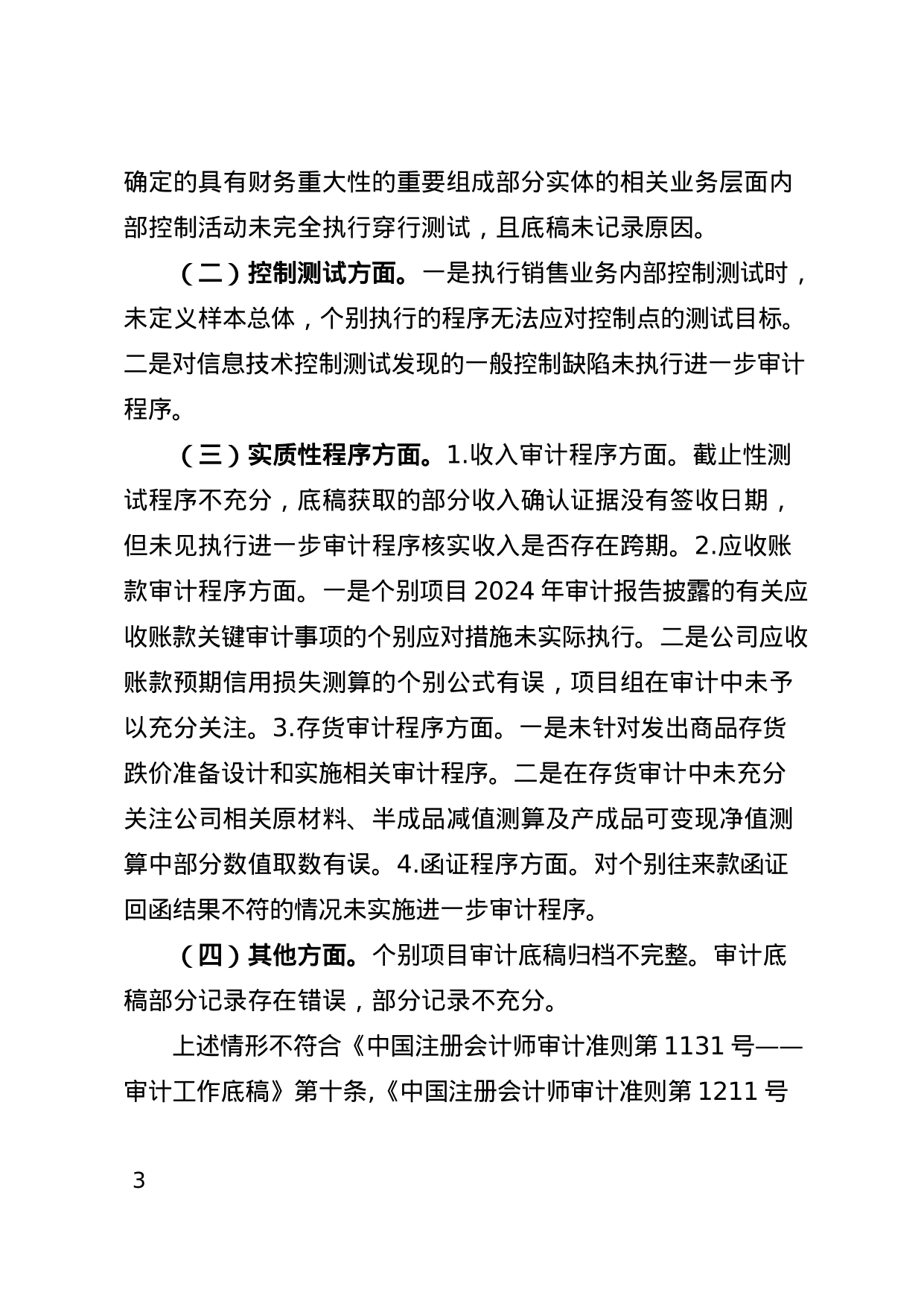 项目执业质量方面,风险评估、控制测试、实质性程序执行不到位,个别项目审计底稿归档不完整,审计底稿部分记录存在错误,部分记录不充分。