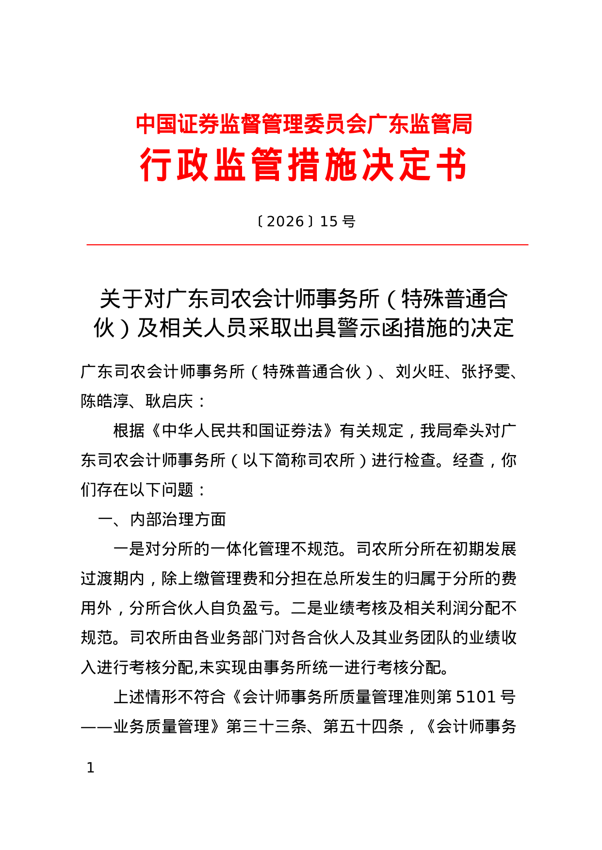 对此,广东证监局决定对广东司农会计师事务所(特殊普通合伙)及刘火旺、张抒雯、陈皓淳、耿启庆采取出具警示函的行政监管措施。