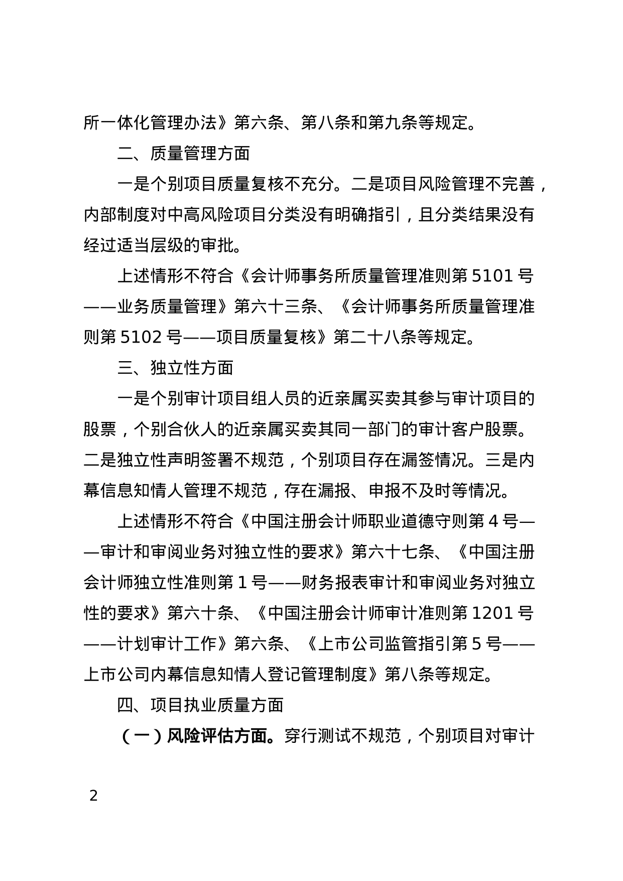 独立性方面,个别审计项目组人员的近亲属买卖其参与审计项目的股票,个别合伙人的近亲属买卖其同一部门的审计客户股票;独立性声明签署不规范,个别项目存在漏签情况;内幕信息知情人管理不规范,存在漏报、申报不及时等情况。