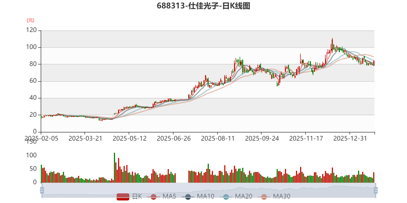 中证智能财讯仕佳光子(688313)1月27日晚间披露2025年度业绩预告,预计2025年实现营业收入21.29亿元,同比增长98.13%;归母净利润3.42亿元,同比增长425.95%;扣非净利润预计3.41亿元,同比增长607.73%。以1月27日收盘价计算,仕佳光子目前市盈率(TTM)约为111.31倍,市净率(LF)约25.75倍,市销率(TTM)约17.85倍。