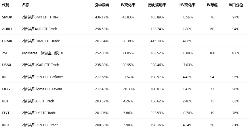 美股ETF引申波幅排行榜前十(标的要求:市值>100亿美元)