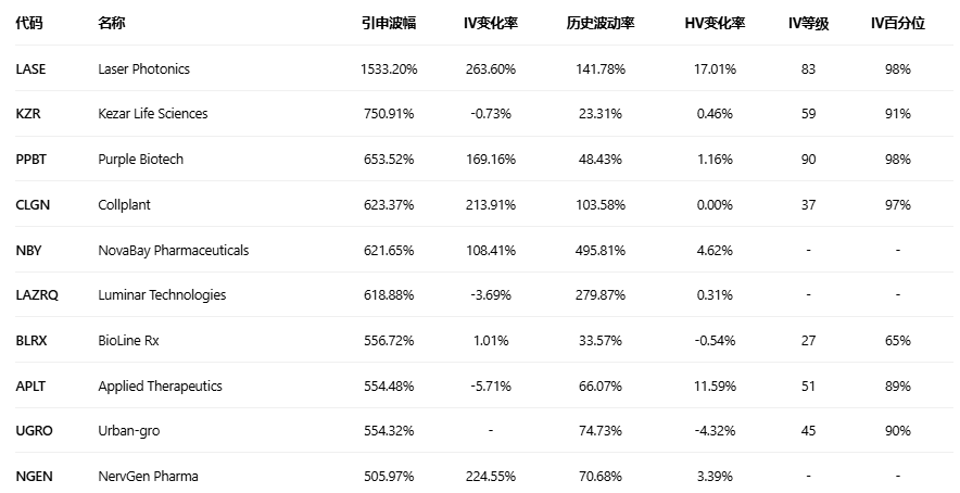引申波幅排行榜(标的市值>10亿美元,且期权成交量>10万)