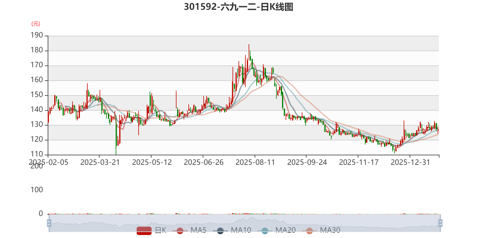 中证智能财讯六九一二(301592)1月27日晚间披露2025年度业绩预告,预计2025年归母净利润3900万元至5800万元,同比下降40.48%-59.97%;扣非净利润预计3700万元-5500万元,同比下降44.31%-62.54%。以1月27日收盘价计算,六九一二目前市盈率(TTM)约为152.91倍-227.41倍,市净率(LF)约10.12倍,市销率(TTM)约17.5倍。