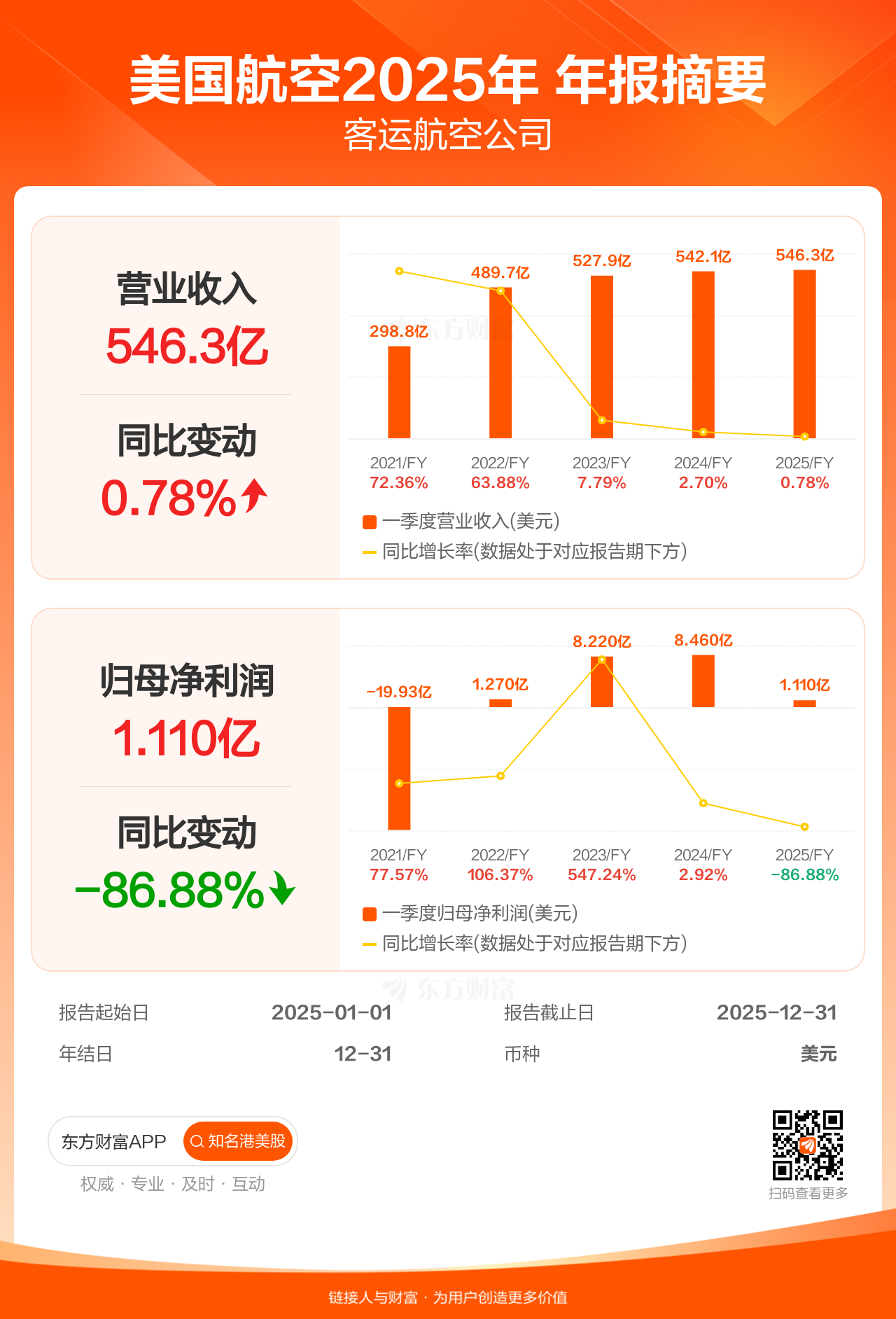 美国航空1月27日发布年报业绩,截至2025年12月31日的12个月内,该公司营业收入546.33亿美元,同比增长0.78%;公司权益持有人应占溢利(归母净利润)1.11亿美元,同比减少86.88%。