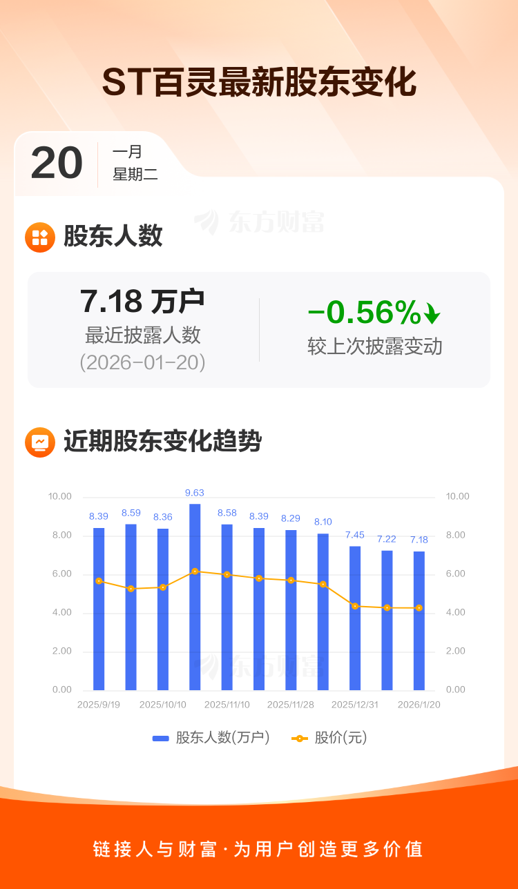 ST百灵最新披露数据显示,截至1月20日公司股东户数为7.18万户,较上期(2026年1月9日)减少401户,降幅为0.56%。户均持有流通股数量由上期的1.68万股上升至1.69万股,户均持股金额由上期的7.18万元增加至7.20万元。