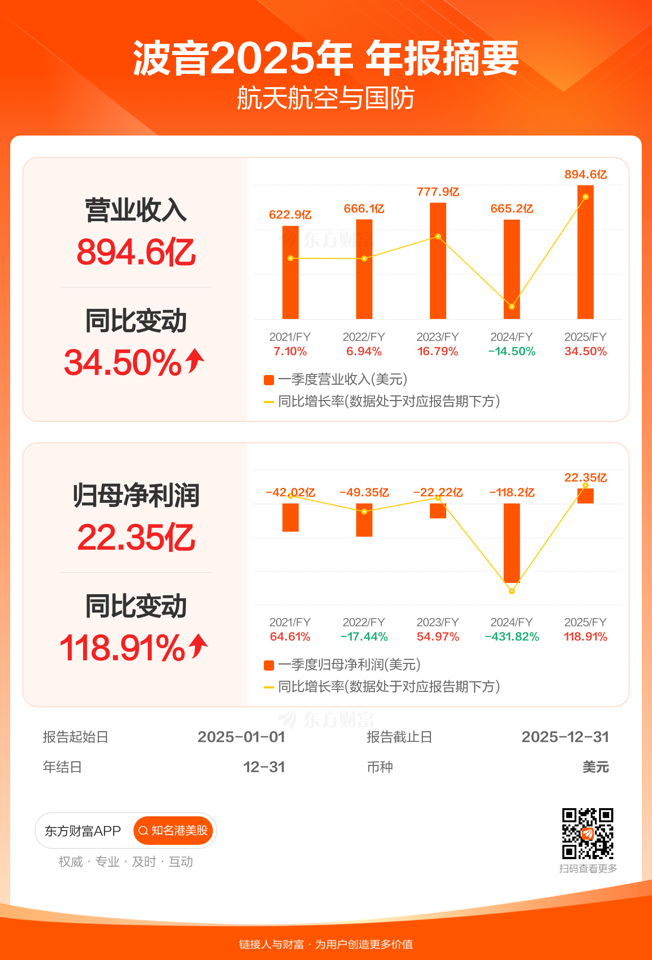 波音1月27日发布年报业绩,截至2025年12月31日的12个月内,该公司营业收入894.63亿美元,同比增长34.50%;公司权益持有人应占溢利(归母净利润)22.35亿美元,同比增长118.91%,低于机构一致预测的25.31亿美元。