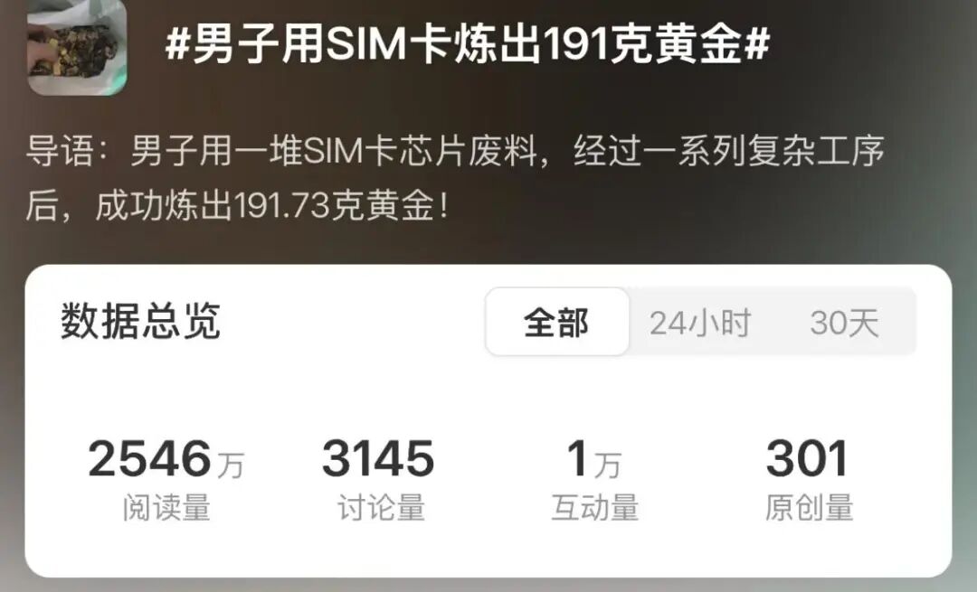 近日,“男子用 SIM 卡炼出 191.73 克黄金”的话题冲上热搜,引发了广泛关注。对此,广东省黄金协会国家高级黄金分析师谢雪美在接受南都·湾财社记者采访时表示,电子废料含金量极低,且具有一定的技术门槛,稍有不慎易引发事故。