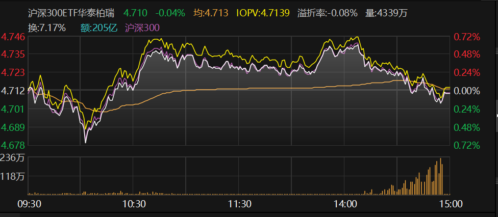 1月27日,临收盘最后半小时,多只宽基ETF成交额激增。其中,华泰柏瑞沪深300ETF全天成交额为205亿元,最后半小时左右成交额为134亿元。