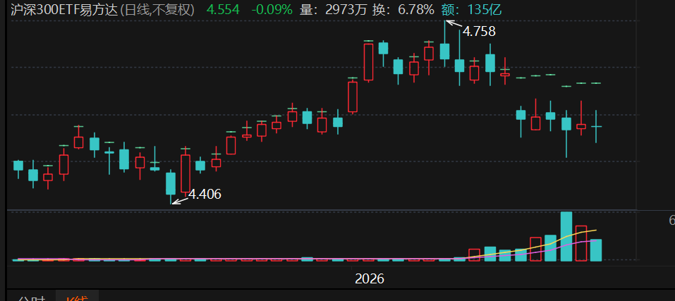 具体来看,1月27日华泰柏瑞沪深300ETF全天成交额为205亿元,自14:30开始,最后半小时左右成交额为134亿元。