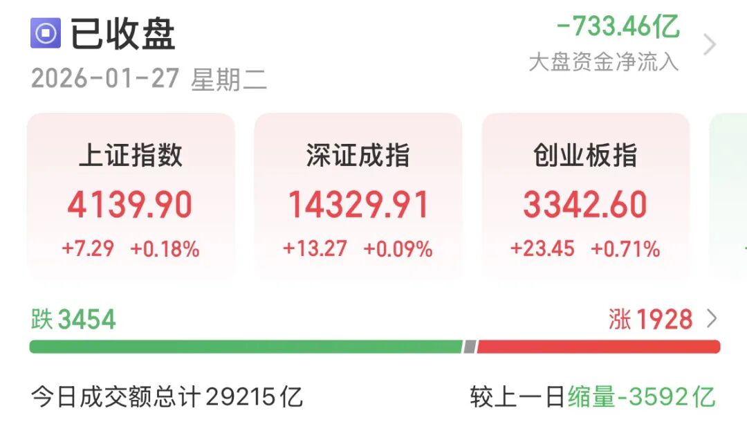 1月27日,A股市场亏钱效应明显,早盘一度逾4400只个股飘绿,所幸权重股护盘,主要指数微幅收红,半导体、通信设备、航空航天等板块活跃。