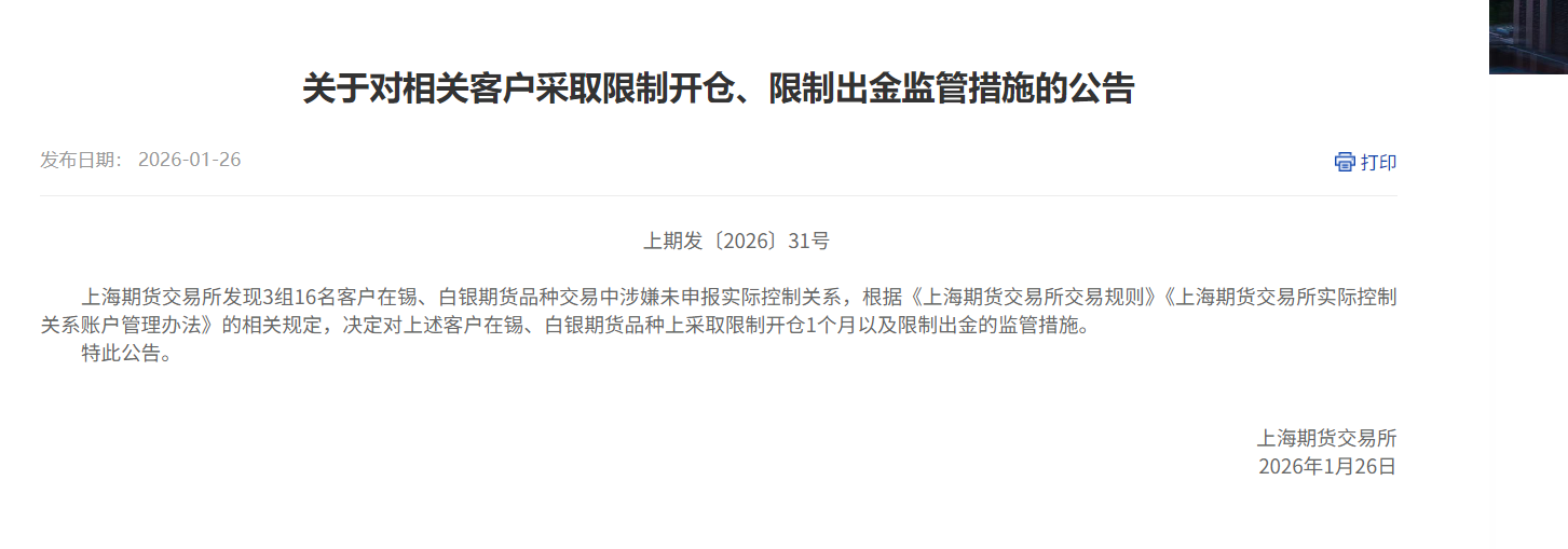 1 月 26 日,上海期货交易所(以下简称 “上期所”)突发监管公告,宣布对 3 组共 16 名客户采取严厉监管措施,在锡、白银期货品种上实施 1 个月的限制开仓,并同步执行限制出金措施。当日盘后,监管力度进一步升级:上期所宣布自 1 月 26 日夜盘起,调整白银、锡期货全系列上市合约的交易限额,其中白银期货各合约日内开仓上限设为 800 手,锡期货各合约则限制在 200 手以内。监管系列组合拳迅速见效,业内分析,此次上交所同步采取两项措施“实属罕见”,并持续加码监控力度,标志着未来严监管也将常态化。