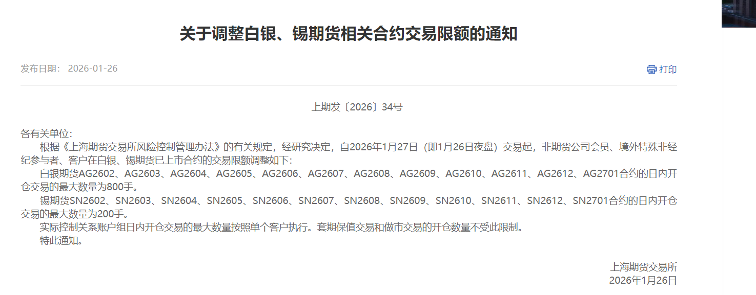 与此同时,上期所 1 月 26 日晚再发公告,即于次日起生效,此次调整覆盖白银、锡期货全系列 12 个合约(AG2602 至 AG2701、SN2602 至 SN2701),具体标准为,白银期货日内开仓上限从3000手下调至800手限额。锡期货日内开仓上限从800手下调至 200 手限额。公告再次强调实际控制关系账户组按单个客户标准执行,杜绝通过分仓规避限制。