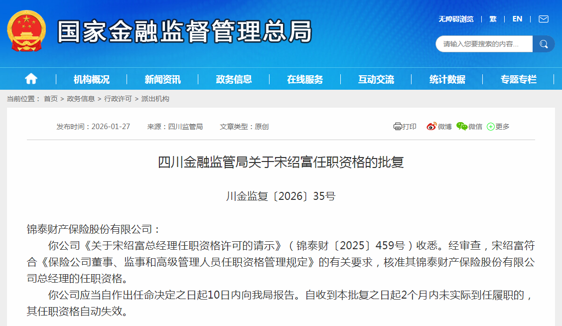 1月27日,四川金融监管局发布批复,核准宋绍富锦泰财产保险股份有限公司(下称“锦泰财险”)总经理的任职资格。