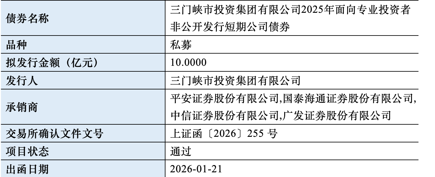 【大河财立方消息】1月27日,三门峡市投资集团有限公司2025年面向专业投资者非公开发行短期公司债券获上交所通过。该债券拟发行金额10亿元,承销商为平安证券、国泰海通、中信证券和广发证券。2025年6月26日,经中诚信国际综合评定,发行人主体信用评级为AA+,展望稳定。