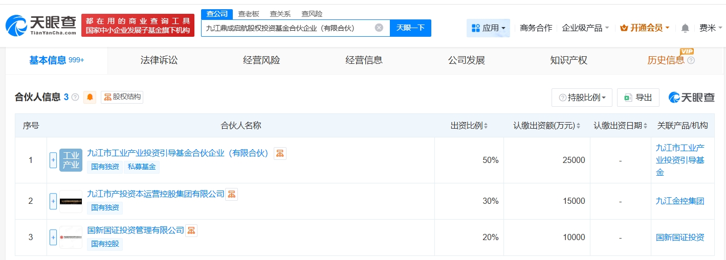 每经AI快讯,天眼查App显示,近日,九江鼎成启航股权投资基金合伙企业(有限合伙)成立,执行事务合伙人为国新国证投资管理有限公司,出资额5亿元人民币,经营范围为以私募基金从事股权投资、投资管理、资产管理等活动,由九江市工业产业投资引导基金合伙企业(有限合伙)、九江市产投资本运营控股集团有限公司、中国国新旗下国新国证投资管理有限公司共同出资。