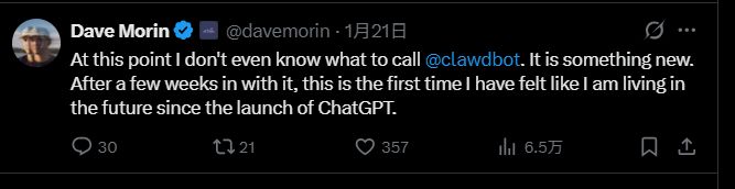知名投资人戴夫·莫林(Dave Morin)感叹,这是自ChatGPT发布以来,他第一次感觉自己真正“生活在未来”。前特斯拉AI总监Andrej Karpathy也公开表达了对Clawdbot的喜爱。