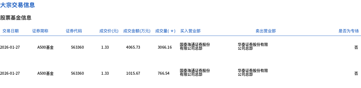1月27日,A500基金大宗交易成交3832.7万股,成交额5081.4万元,占当日总成交额的0.42%,成交价1.33元,较市场收盘价1.325元溢价0.38%。