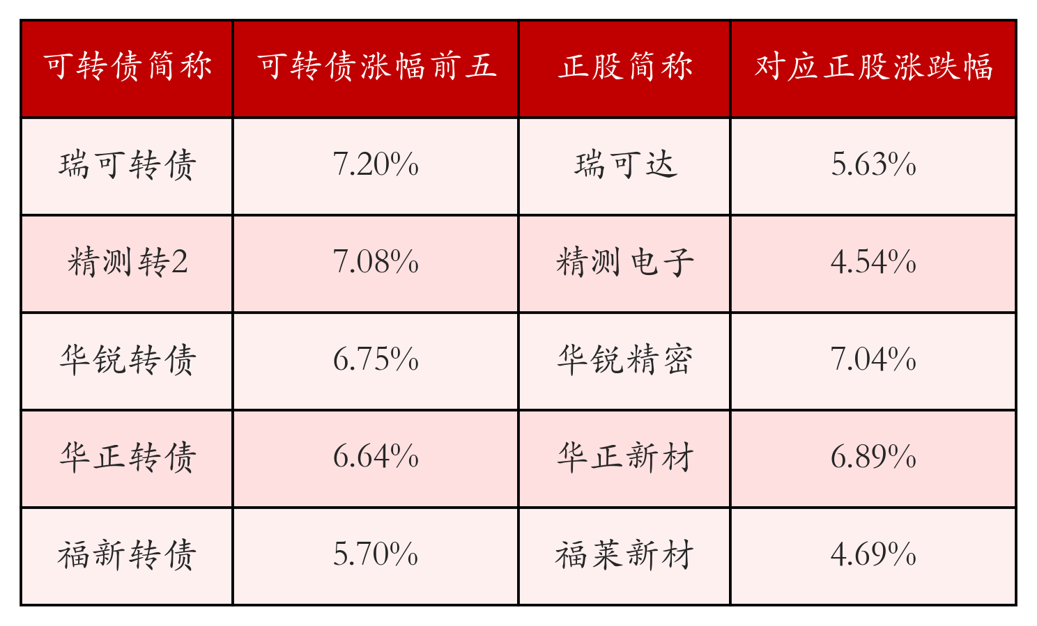 南财智讯1月27日电,盘后数据显示,债市方面,中证转债指数收涨0.15%,报528.95,成交额为851.61亿元。可转债方面,今日共成交374只可转债,其中167只收涨,0只收平,207只收跌。具体来看,43只可转债涨幅超过2%。其中瑞可转债(118060)涨7.2%,精测转2(123176)涨7.08%,华锐转债(118009)涨6.75%。今日有10只可转债跌幅超2%,银邦转债(123252)跌9.49%,科华转债(128124)跌6.7%,富淼转债(118029)跌4.85%。存在交易量的可转债所对应的正股中,146只收涨,7只收平,221只收跌。具体来看,14只可转债对应正股涨幅超过5%,其中,苏博特(603916)涨停,收涨9.98%。同时所对应的可转债:博22转债(113650)同涨1.0%。今日有6只可转债对应正股跌幅超过5%,没有正股跌停。