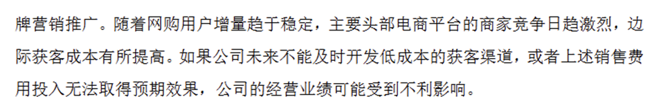 公司在招股书内也表明,销售费用支出主要用于电商平台的产品销售及品牌营销推广,如果公司未来不能及时开发低成本的获客渠道,或者上述销售费用投入无法取得预期效果,公司的经营业绩可能受到不利影响。