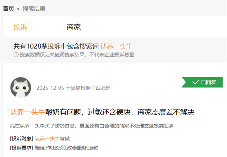 值得注意的是,品牌主打“高端、安全”的核心定位,正被频发的品控问题不断侵蚀。在黑猫投诉等第三方平台上,截至1月26日,涉及“认养一头牛”的投诉量已超1028条,投诉焦点集中于产品中发现异物、变质异味、食用后身体不适等问题,直接将品牌供应链质量管控能力推向舆论风口。