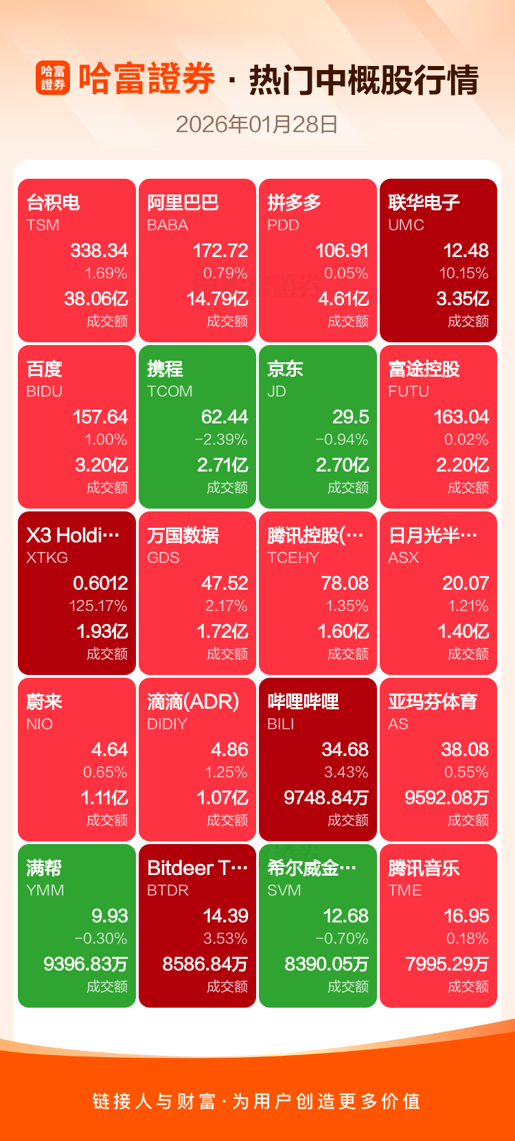台积电涨1.69%,阿里巴巴涨0.79%,拼多多涨0.05%,联华电子涨10.15%,百度涨1.00%,携程跌2.39%,京东跌0.94%,富途控股涨0.02%,X3 Holdings Co Ltd-A涨125.17%,万国数据涨2.17%。