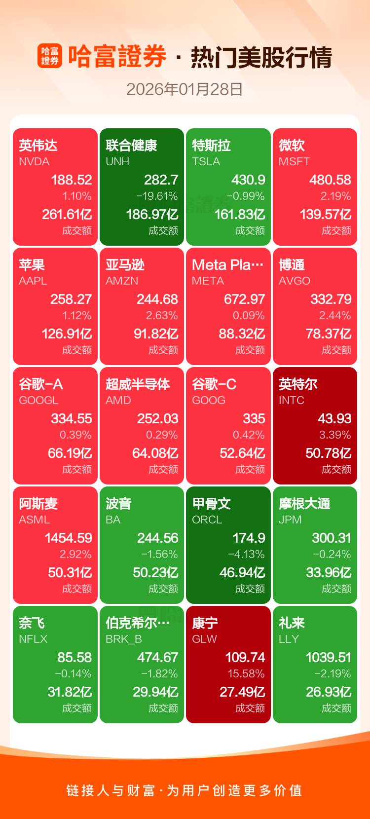 英伟达涨1.10%,联合健康跌19.61%,特斯拉跌0.99%,微软涨2.19%,苹果涨1.12%,亚马逊涨2.63%,Meta Platforms Inc-A涨0.09%,博通涨2.44%,谷歌-A涨0.39%,超威半导体涨0.29%。