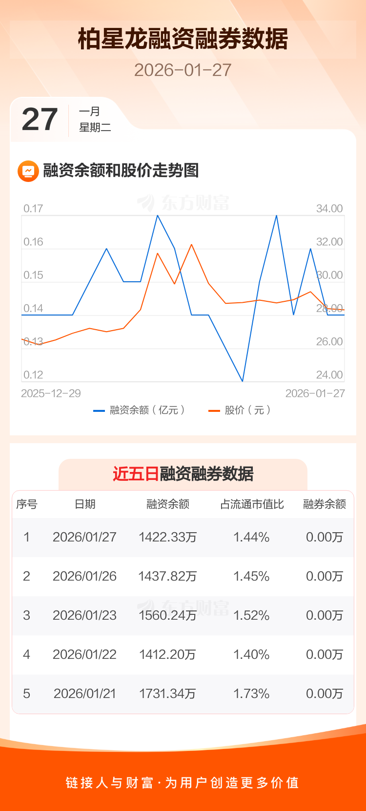 交易所最新数据显示,柏星龙于2026年1月27日获融资买入193.08万元,融资偿还208.57万元,当日融资净偿还15.49万元。目前,该股融资余额1422.33万,占流通市值比例为1.44%。