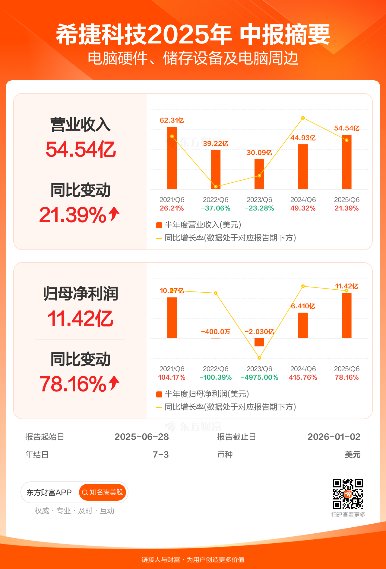 希捷科技1月27日发布中期业绩,截至2026年1月2日的6个月内,该公司营业收入54.54亿美元,同比增长21.39%;公司权益持有人应占溢利(归母净利润)11.42亿美元,同比增长78.16%。