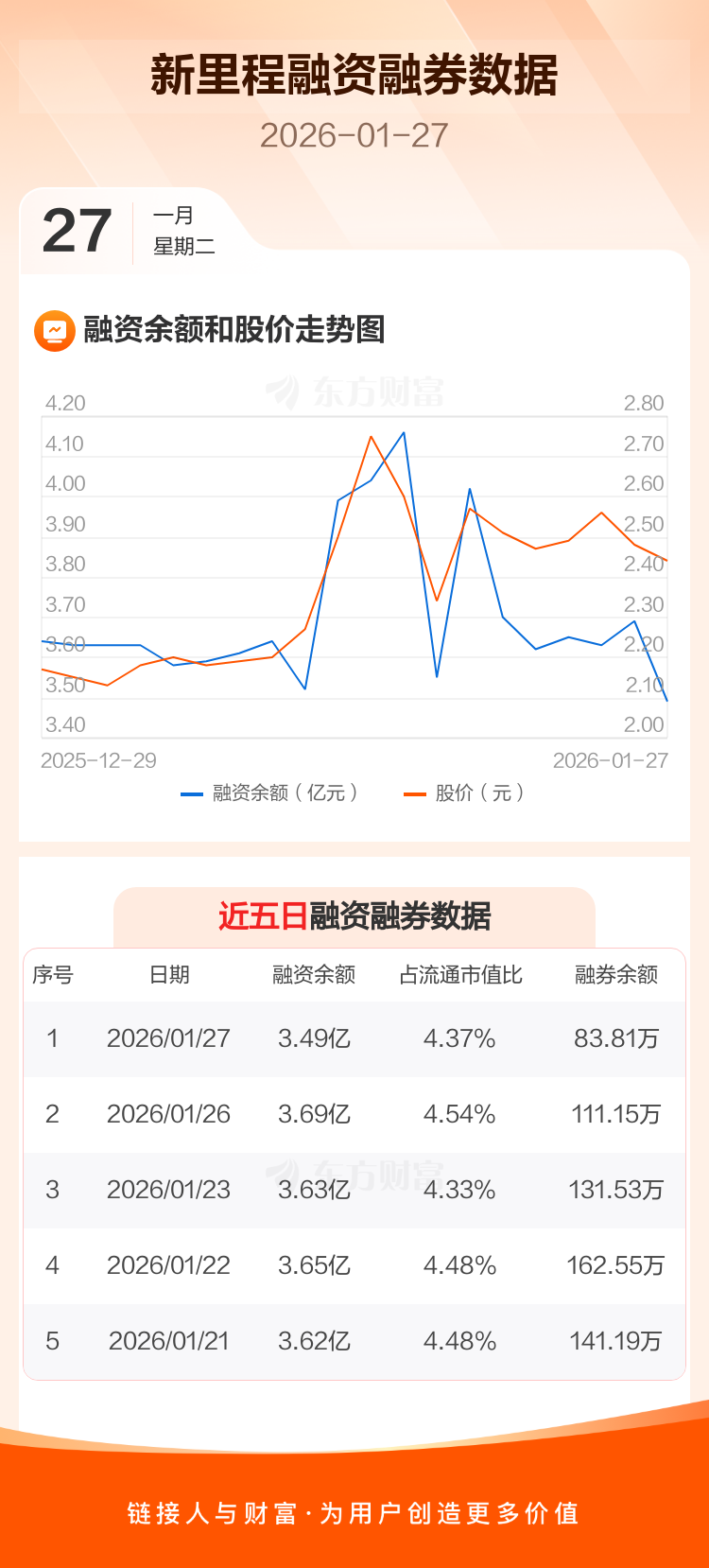 交易所最新数据显示,新里程于2026年1月27日获融资买入2157.62万元,融资偿还4107.62万元,当日融资净偿还1950万元。目前,该股融资余额3.49亿,占流通市值比例为4.37%。