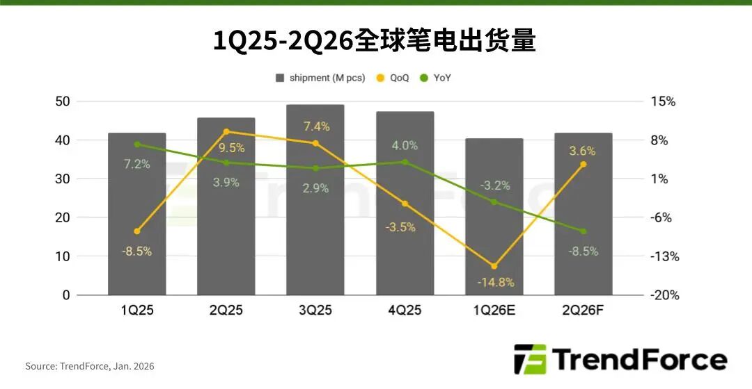 市场调查机构TrendForce集邦咨询1月26日发布的产业报告显示,全球笔记本电脑品牌自去年下半年起面临存储器价格显著上涨的压力,2026年初又遭遇CPU阶段性供给缺口、价格调涨的压力,加上PCB、电池、电源管理IC等零部件成本同步上行,预计将导致全球笔记本电脑今年第一季度出货量减少14.8%。