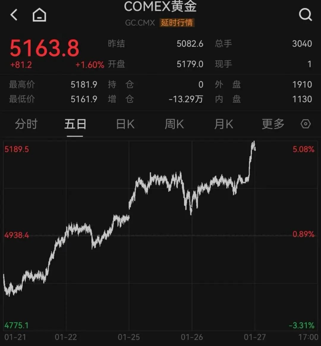COMEX黄金期货指数继续上涨,截至发稿,点位涨至5160美元/盎司。