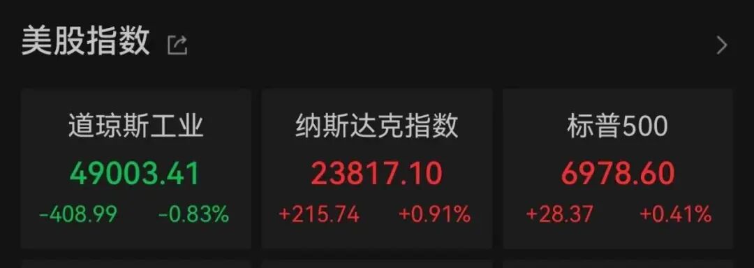 截至收盘,标普500指数上涨0.41%,报6978.60点;纳斯达克综合指数上涨0.91%,报23817.10点;道琼斯指数下跌0.83%,报49003.41点。