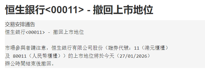 1月27日,根据香港联交所的批准,恒生银行上市地位在办公时间结束后撤回。这也就意味着,恒生银行正式从港交所退市。