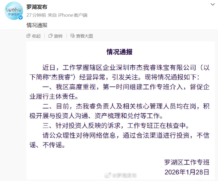 1月28日,罗湖区工作专班发布情况通报,近日,辖区企业深圳市杰我睿珠宝有限公司(以下简称“杰我睿”)经营异常,引发关注。现将情况通报如下: