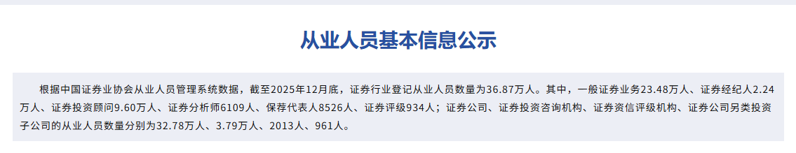 【大河财立方消息】1月28日,根据中国证券业协会从业人员管理系统数据,截至2025年12月底,证券行业登记从业人员数量为36.87万人。