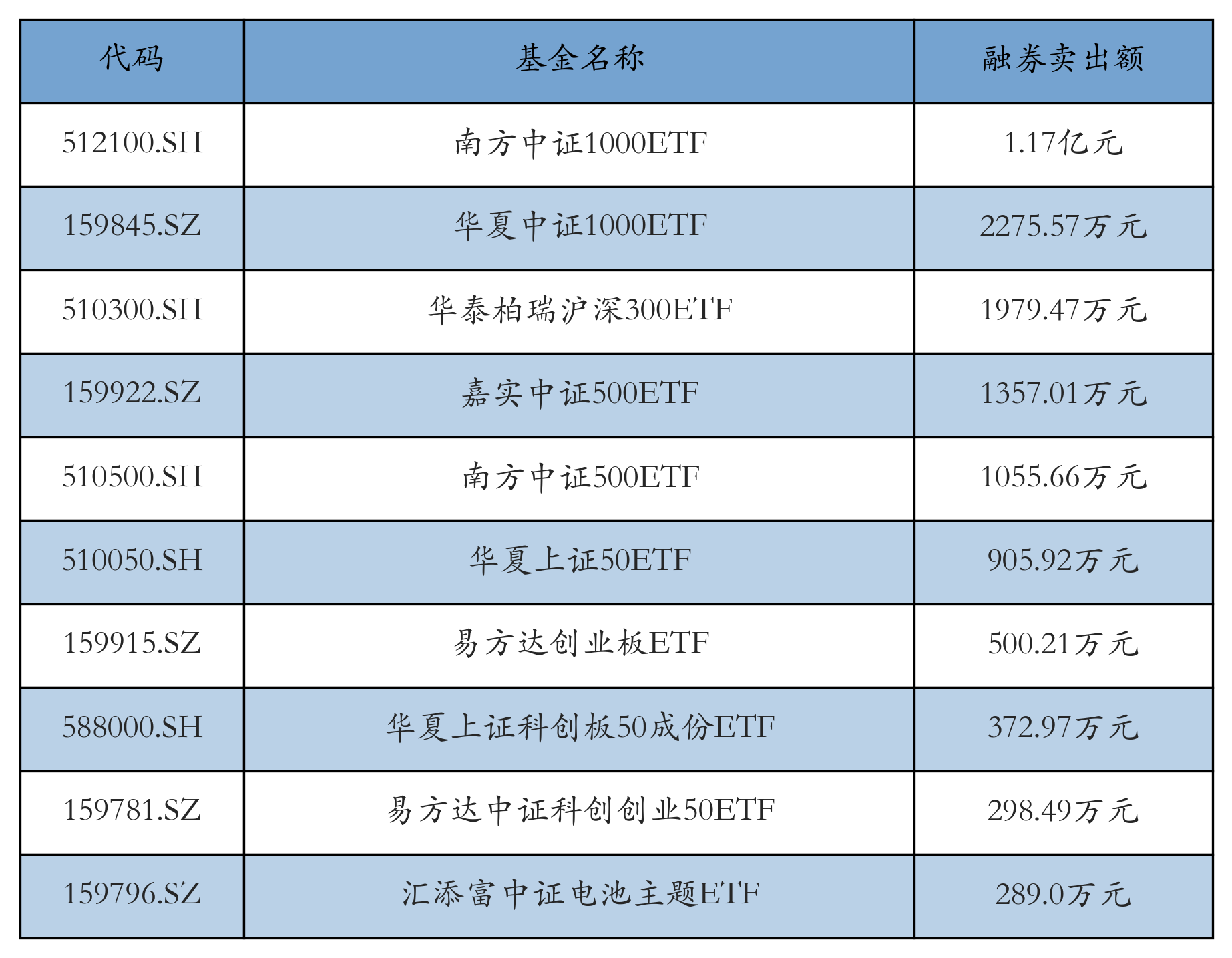1月27日ETF融券卖出额前三位分别为:南方中证1000ETF(1.17亿元)、华夏中证1000ETF(2275.57万元)和华泰柏瑞沪深300ETF(1979.47万元),前10具体见下表: