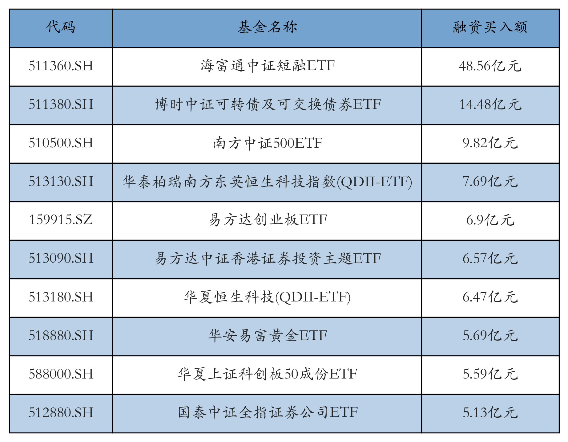 1月27日ETF融资买入额前三位分别为:海富通中证短融ETF(48.56亿元)、博时中证可转债及可交换债券ETF(14.48亿元)和南方中证500ETF(9.82亿元),前10具体见下表: