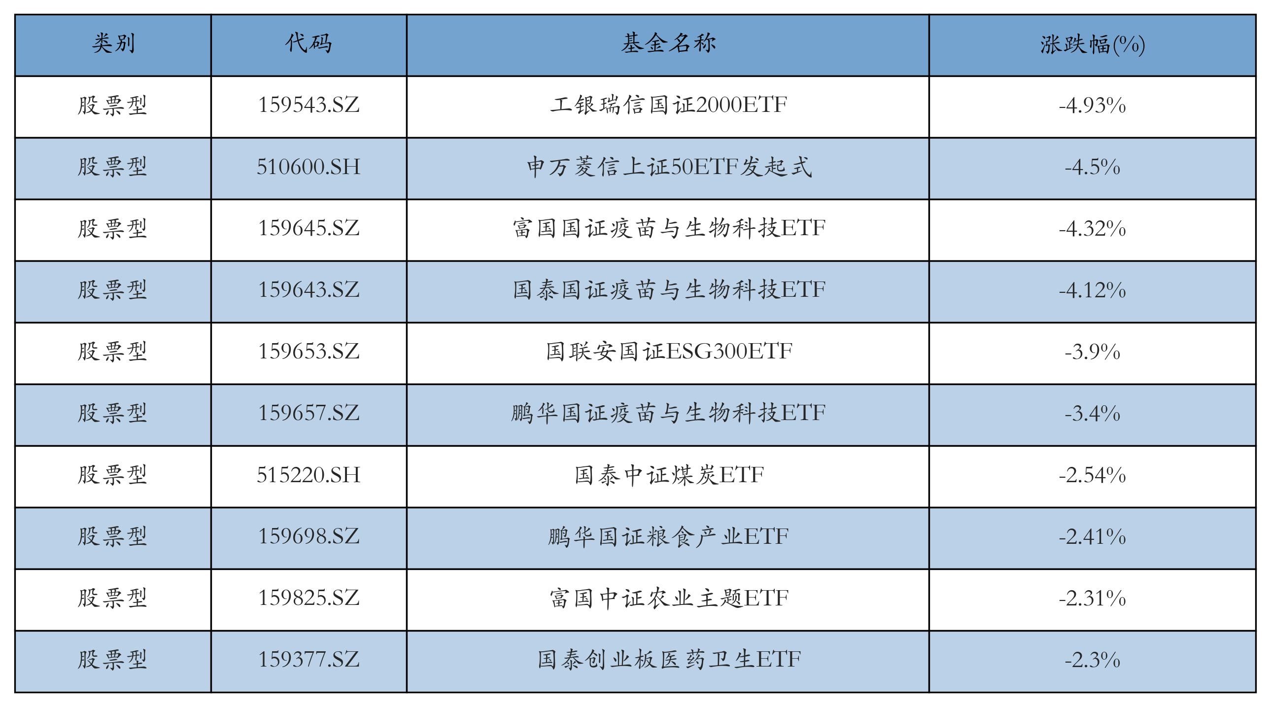 昨日股票型ETF跌幅最大的3只ETF及其收益率分别为:工银瑞信国证2000ETF(-4.93%)、申万菱信上证50ETF发起式(-4.5%)、富国国证疫苗与生物科技ETF(-4.32%)。跌幅前10详情见下表: