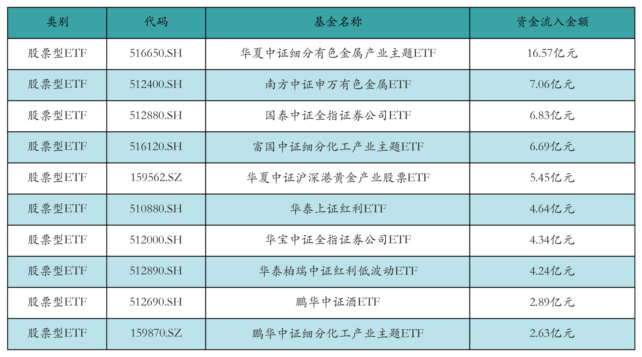 昨日股票型ETF资金流入最多的3只ETF及其流入金额分别为:华夏中证细分有色金属产业主题ETF(流入16.57亿元)、南方中证申万有色金属ETF(流入7.06亿元)、国泰中证全指证券公司ETF(流入6.83亿元)。资金流入前10详情见下表:
