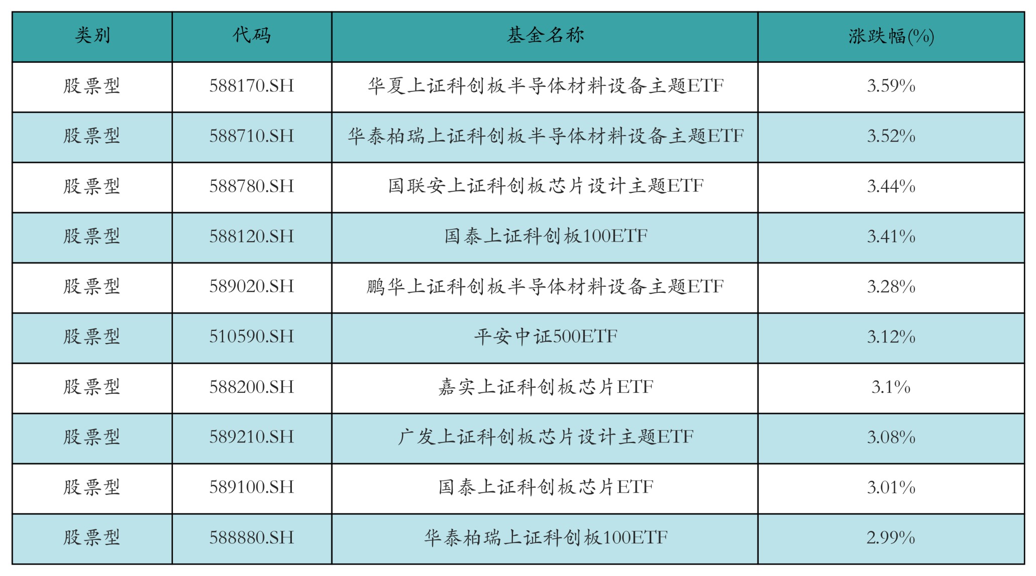 昨日股票型ETF涨幅最高的3只ETF及其收益率分别为:华夏上证科创板半导体材料设备主题ETF(3.59%)、华泰柏瑞上证科创板半导体材料设备主题ETF(3.52%)、国联安上证科创板芯片设计主题ETF(3.44%)。涨幅前10详情见下表:
