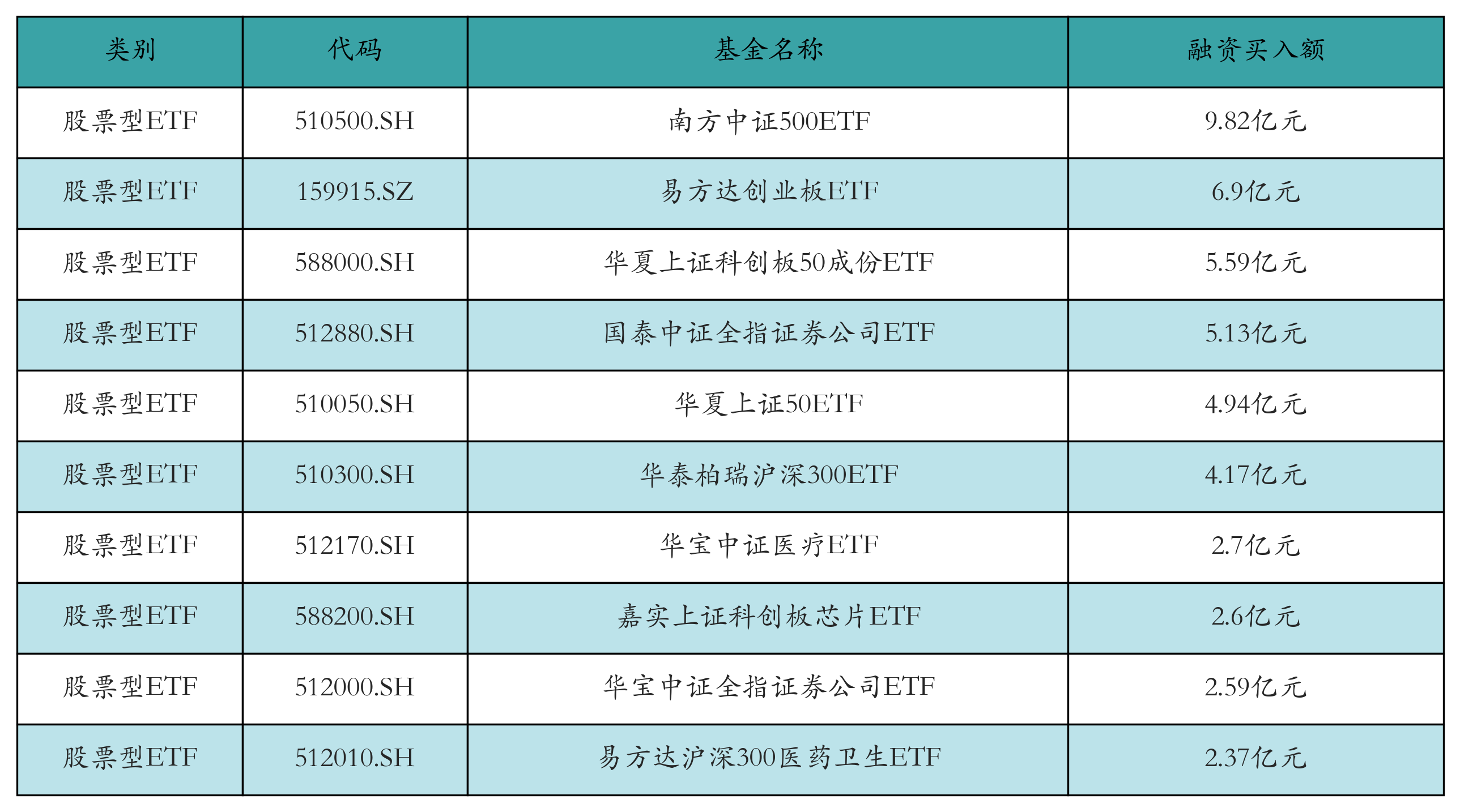 昨日股票型ETF融资买入额最高的3只ETF及其买入金额分别为:南方中证500ETF(9.82亿元)、易方达创业板ETF(6.9亿元)、华夏上证科创板50成份ETF(5.59亿元)。融资买入额前10详情见下表: