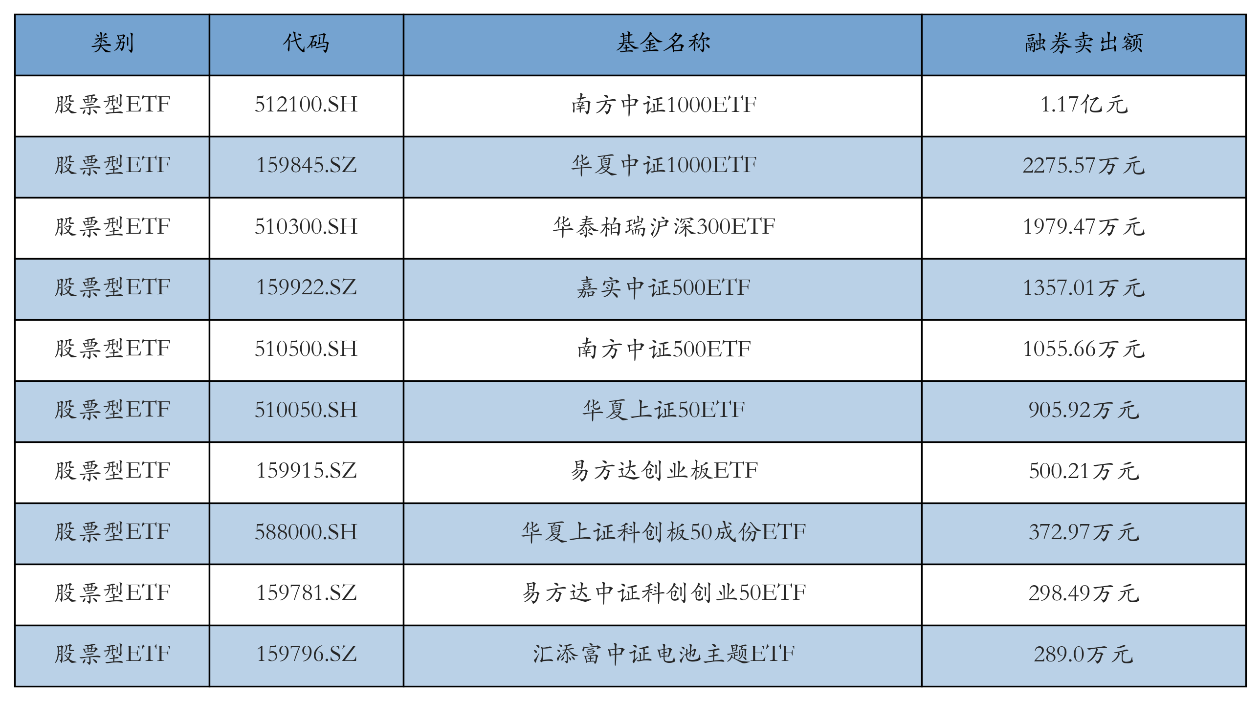 昨日股票型ETF融资卖出额最高的3只ETF及其卖出金额分别为:南方中证1000ETF(1.17亿元)、华夏中证1000ETF(2275.57万元)、华泰柏瑞沪深300ETF(1979.47万元)。融券卖出额前10详情见下表: