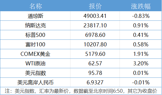 1、美股三大指数涨跌不一,道指跌0.83%,纳指涨0.91%,标普500指数涨0.41%并创收盘新高。热门中概股涨跌互现,纳斯达克中国金龙指数收涨0.48%。COMEX黄金期货涨1.91%,报5179.6美元/盎司。现货黄金盘中突破5190美元/盎司,最高报5190.4美元/盎司,再创历史新高。