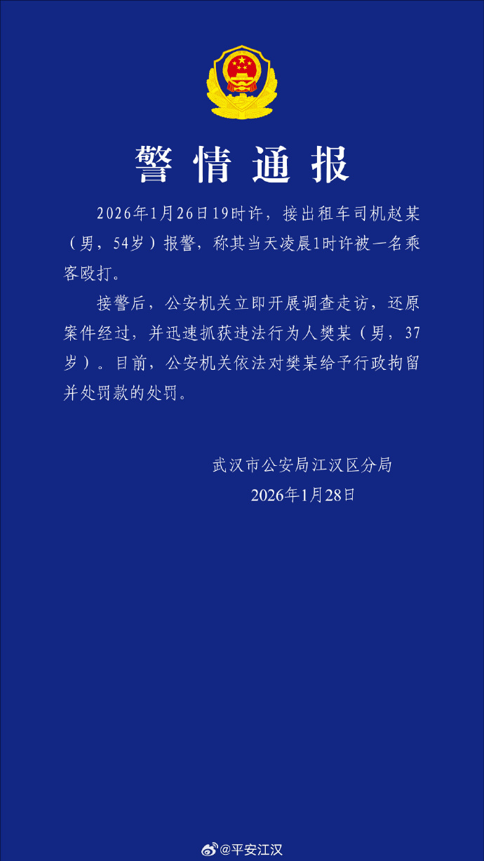 武汉市公安局江汉区分局1月28日通报:1月26日19时许,接出租车司机赵某(男,54岁)报警,称其当天凌晨1时许被一名乘客殴打。接警后,公安机关立即开展调查走访,还原案件经过,并迅速抓获违法行为人樊某(男,37岁)。目前,公安机关依法对樊某给予行政拘留并处罚款的处罚。