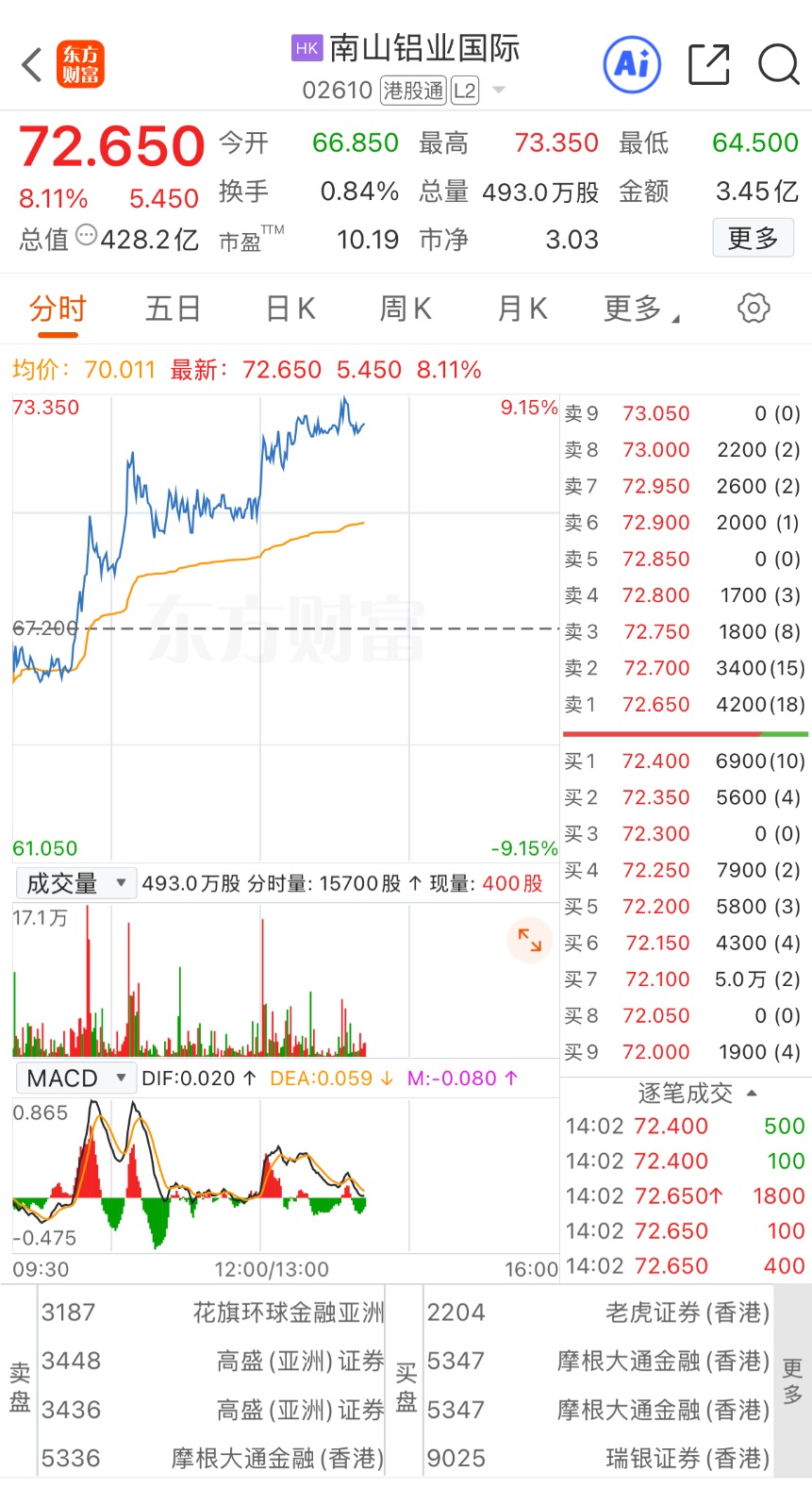上证报中国证券网讯1月28日,南山铝业国际震荡走强,一度涨超9%,截至14时03分,涨8.11%,报72.65港元/股。