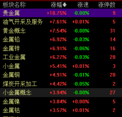 盘面上,黄金、有色金属板块掀涨停潮,油气、煤炭、化工、稀土行业走强。